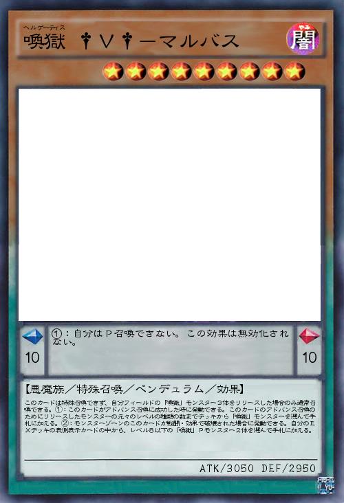 | このカードは特殊召喚できず、自分フィールドの「喚獄」モンスター3体をリリースした場合のみ通常召喚できる。①:このカードがアドバンス召喚に成功した時に発動できる。このカードのアドバンス召喚のためにリリースしたモンスターの元々のレベルの種類の数までデッキから「喚獄」モンスターを選んで手札に加える。②:モンスターゾーンのこのカードが戦闘・効果で破壊された場合に発動できる。自分のEXデッキの表側表示カードの中から、レベル8以下の「喚獄」Pモンスター2体を選んで手札に加える。 | |||