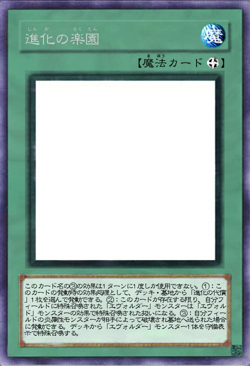| このカード名の③の効果は1ターンに1度しか使用できない。①:このカードの発動時の効果処理として、デッキ・墓地から「進化の代償」1枚を選んで発動できる。②:このカードが存在する限り、自分フィールドに特殊召喚された「エヴォルダー」モンスターは「エヴォルド」モンスターの効果で特殊召喚された扱いになる。③:自分フィールドの炎属性モンスターが相手によって破壊され墓地へ送られた場合に発動できる。デッキから「エヴォルダー」モンスター1体を守備表示で特殊召喚する。 | |||