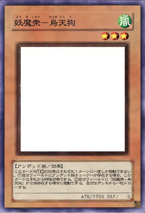 | このカードの①②の効果はそれぞれ1ターンに一度しか発動できない。①自分フィールドにアンデッド族チューナーが存在する場合、このカードは手札から特殊召喚できる。②自分フィールドに「妖魔衆-烏天狗」が2体存在する場合に発動できる。自分はデッキから一枚ドローする。 | |||