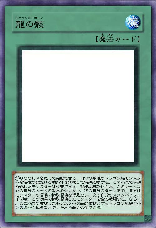 | ①800LPを払って発動できる。自分の墓地のドラゴン族モンスターを任意の数だけ召喚条件を無視して特殊召喚する。この効果で特殊召喚したモンスターは攻撃できず、効果は無効化され、このカード以外の自分のカードの効果を受けない。次の自分のターンまで、自分はモンスターの召喚・特殊召喚を行えない。次の自分のスタンバイフェイズ時、この効果で特殊召喚したモンスターを全て破壊する。さらに、この効果で破壊したモンスターを融合素材とするドラゴン族融合モンスター1体をEXデッキから融合召喚できる。 | |||
