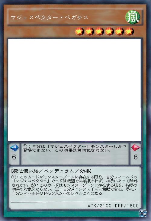 | ①:このカードがモンスターゾーンに存在する限り、自分フィールドの「マジェスペクター」カードは戦闘では破壊されず、相手によって除外されない。②:このカードはモンスターゾーンに存在する限り、相手の効果の対象にならない。③:自分メインフェイズに発動できる。手札・自分フィールドのPモンスターのレベルは4になる。 | |||