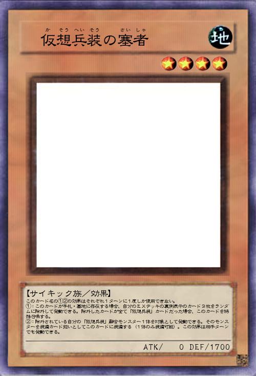 | このカード名の①②の効果はそれぞれ1ターンに1度しか使用できない。 ①:このカードが手札・墓地に存在する場合、自分のEXデッキの裏側表示のカード3枚をランダムに除外して発動できる。除外したカードが全て「仮想兵装」カードだった場合、このカードを特殊召喚する。 ②:除外されている自分の「仮想兵装」融合モンスター1体を対象として発動できる。そのモンスターを装備カード扱いとしてこのカードに装備する(1体のみ装備可能)。この効果は相手ターンでも発動できる。 | |||