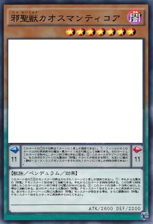 | このカード名の①②のモンスター効果はそれぞれ1ターンに1度しか使用できない。①:手札から光属性の「邪聖」Pモンスター1体を捨てて発動できる。手札からこのカードを特殊召喚する。この効果で特殊召喚したこのカードはターン終了時まで攻撃力が半分になる。②:このカードの召喚・P召喚に成功した場合に発動できる。自分のデッキから光属性の「邪聖」Pモンスター1体をEXデッキに表側表示で加える。自分モンスターゾーンに既に光属性の「邪聖」モンスターが存在する場合、さらに闇属性の「邪聖」Pモンスター1体をEXデッキに表側表示で加えてもよい。 | |||