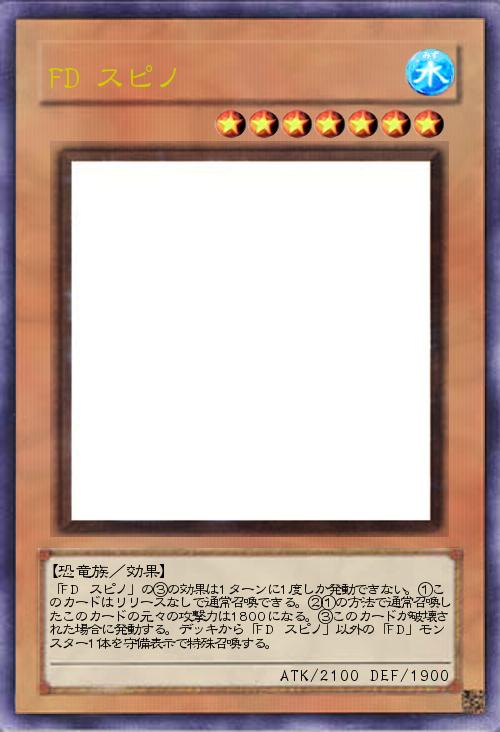 | 「FD スピノ」の③の効果は1ターンに1度しか発動できない。①このカードはリリースなしで通常召喚できる。②①の方法で通常召喚したこのカードの元々の攻撃力は1800になる。③このカードが破壊された場合に発動する。デッキから「FD スピノ」以外の「FD」モンスター1体を守備表示で特殊召喚する。 | |||