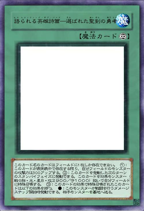 | このカード名のカードはフィールドに1枚しか存在できない。 ①:このカードが表側表示で存在する限り、自分フィールドのモンスターの攻撃力は300アップする。②:このカードを発動した次のターンのスタンバイフェイズに発動できる。このカードを効果モンスター(戦士族・光・星8・攻2900/守1000)扱いで自分フィールドに特殊召喚する。 ③:このカードの効果で特殊召喚されたこのカードは以下の効果を持つ。 ●:このモンスターが戦闘を行うダメージステップ開始時発動できる。相手モンスターを墓地へ送る。 | |||
