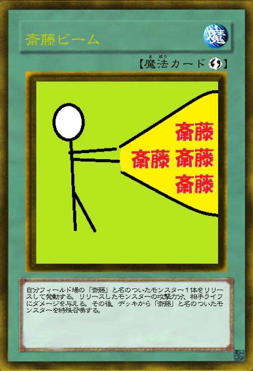 | 自分フィールド場の「斎藤」と名のついたモンスター1体をリリースして発動する。リリースしたモンスターの攻撃力分、相手ライフにダメージを与える。その後、デッキから「斎藤」と名のついたモンスターを特殊召喚する。 | |||