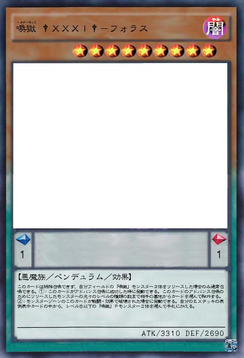 | このカードは特殊召喚できず、自分フィールドの「喚獄」モンスター3体をリリースした場合のみ通常召喚できる。①:このカードがアドバンス召喚に成功した時に発動できる。このカードのアドバンス召喚のためにリリースしたモンスターの元々のレベルの種類の数まで相手の墓地からカードを選んで除外する。②:モンスターゾーンのこのカードが戦闘・効果で破壊された場合に発動できる。自分のEXデッキの表側表示カードの中から、レベル8以下の「喚獄」Pモンスター2体を選んで手札に加える。 | |||