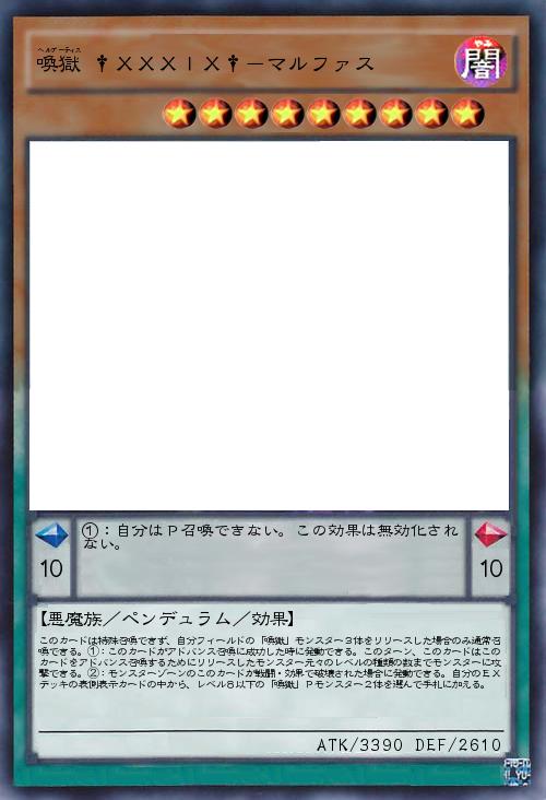 | このカードは特殊召喚できず、自分フィールドの「喚獄」モンスター3体をリリースした場合のみ通常召喚できる。①:このカードがアドバンス召喚に成功した時に発動できる。このターン、このカードはこのカードをアドバンス召喚するためにリリースしたモンスター元々のレベルの種類の数までモンスターに攻撃できる。②:モンスターゾーンのこのカードが戦闘・効果で破壊された場合に発動できる。自分のEXデッキの表側表示カードの中から、レベル8以下の「喚獄」Pモンスター2体を選んで手札に加える。 | |||