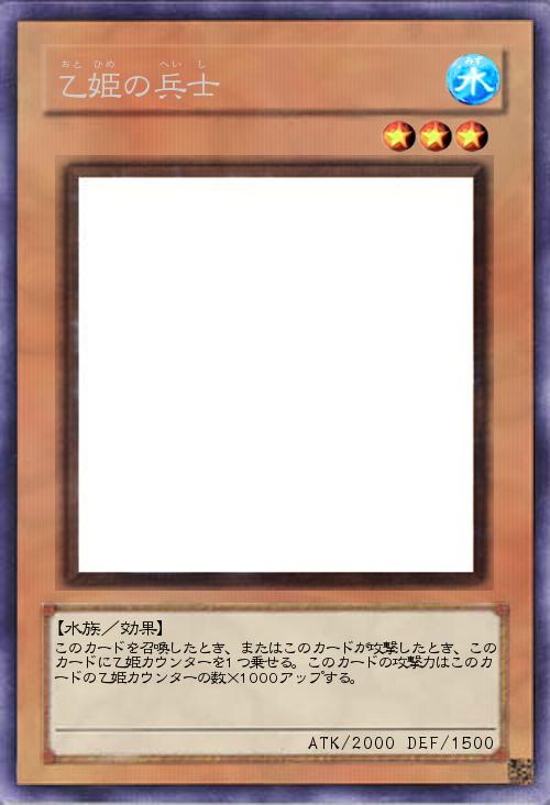 | このカードを召喚したとき、またはこのカードが攻撃したとき、このカードに乙姫カウンターを1つ乗せる。このカードの攻撃力はこのカードの乙姫カウンターの数×1000アップする。 | |||
