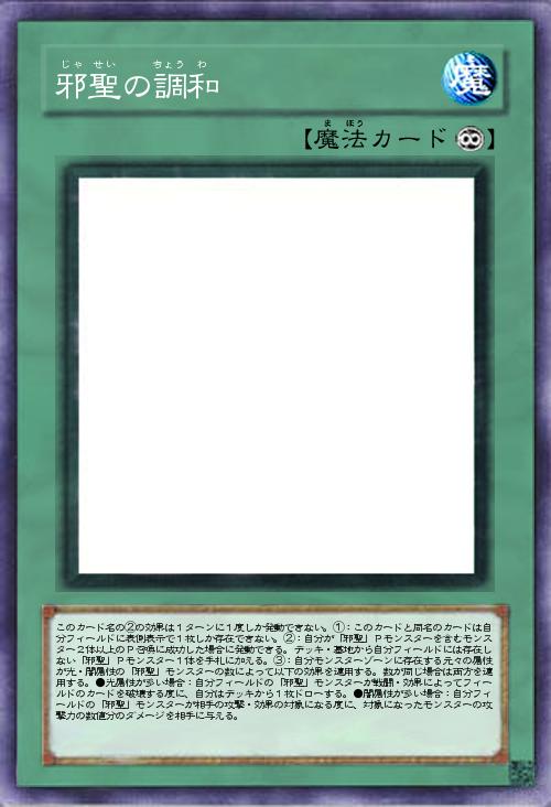| このカード名の②の効果は1ターンに1度しか発動できない。①:このカードと同名のカードは自分フィールドに表側表示で1枚しか存在できない。②:自分が「邪聖」Pモンスターを含むモンスター2体以上のP召喚に成功した場合に発動できる。デッキ・墓地から自分フィールドには存在しない「邪聖」Pモンスター1体を手札に加える。③:自分モンスターゾーンに存在する元々の属性が光・闇属性の「邪聖」モンスターの数によって以下の効果を適用する。数が同じ場合は両方を適用する。●光属性が多い場合:自分フィールドの「邪聖」モンスターが戦闘・効果によってフィールドのカードを破壊する度に、自分はデッキから1枚ドローする。●闇属性が多い場合:自分フィールドの「邪聖」モンスターが相手の攻撃・効果の対象になる度に、対象になったモンスターの攻撃力の数値分のダメージを相手に与える。 | |||