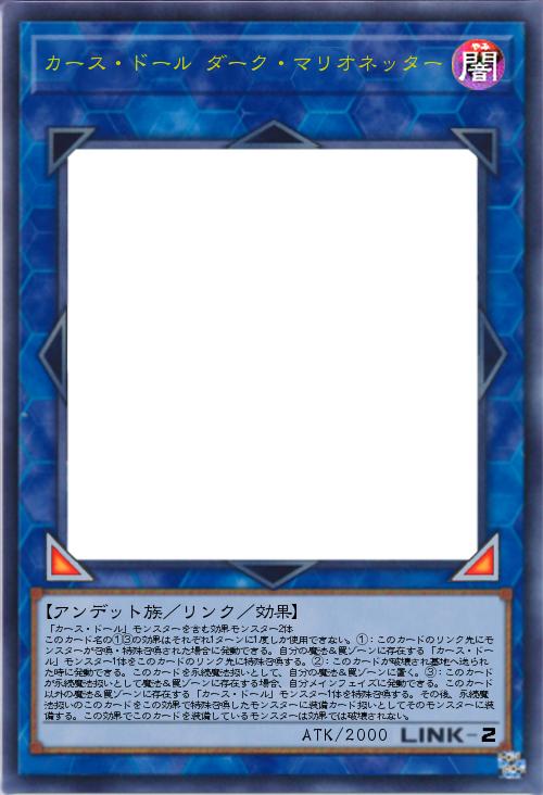 | 「カース・ドール」モンスターを含む効果モンスター2体 このカード名の①③の効果はそれぞれ1ターンに1度しか使用できない。①:このカードのリンク先にモンスターが召喚・特殊召喚された場合に発動できる。自分の魔法&罠ゾーンに存在する「カース・ドール」モンスター1体をこのカードのリンク先に特殊召喚する。②:このカードが破壊され墓地へ送られた時に発動できる。このカードを永続魔法扱いとして、自分の魔法&罠ゾーンに置く。③:このカードが永続魔法扱いとして魔法&罠ゾーンに存在する場合、自分メインフェイズに発動できる。このカード以外の魔法&罠ゾーンに存在する「カース・ドール」モンスター1体を特殊召喚する。その後、永続魔法扱いのこのカードをこの効果で特殊召喚したモンスターに装備カード扱いとしてそのモンスターに装備する。この効果でこのカードを装備しているモンスターは効果では破壊されない。 | |||