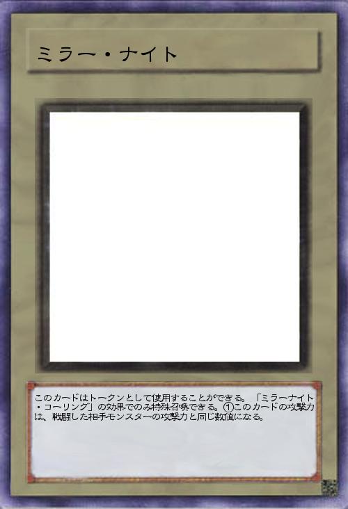 | このカードはトークンとして使用することができる。「ミラーナイト・コーリング」の効果でのみ特殊召喚できる。①このカードの攻撃力は、戦闘した相手モンスターの攻撃力と同じ数値になる。 | |||