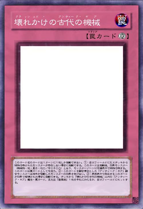 | このカード名のカードは1ターンに1枚しか発動できない。①:自分フィールドにEXデッキから特殊召喚されたモンスターが存在しない場合に発動できる。このカードは発動後、効果モンスター(機械族・地・星8・攻0/守2500)となり、モンスターゾーンに守備表示で特殊召喚する。このカードは罠カードとしても扱う。②:このカードを融合素材とした「アンティーク・ギア」融合モンスターは相手が発動したモンスターの効果を受けない。③:表側表示で存在するこのカードが効果で破壊された場合に発動できる。デッキから「壊れかけの古代の機械」以外の「アンティーク・ギア」魔法・罠カード、または「歯車街」1枚を手札に加えるか、自分フィールドにセットする。 | |||