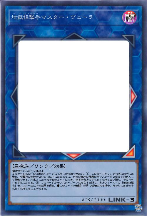 | 闇属性モンスター2体以上 このカード名の①の効果は1ターンに1度しか使用できない。①:このカードがリンク召喚に成功した場合、攻撃力の合計が2000以下になるように、自分の墓地の闇属性モンスターを3体まで対象として発動できる。対象としたそれぞれのカードにつき、相手が自身の手札を1枚捨てない限り、そのカードを手札に加える。②:このカードがモンスターゾーンに存在する限り、自分フィールドの「地獄狙撃手」モンスターは以下の効果を得る。●このカードが戦闘・効果で破壊される場合、代わりに自分の手札を1枚捨てることができる。 | |||