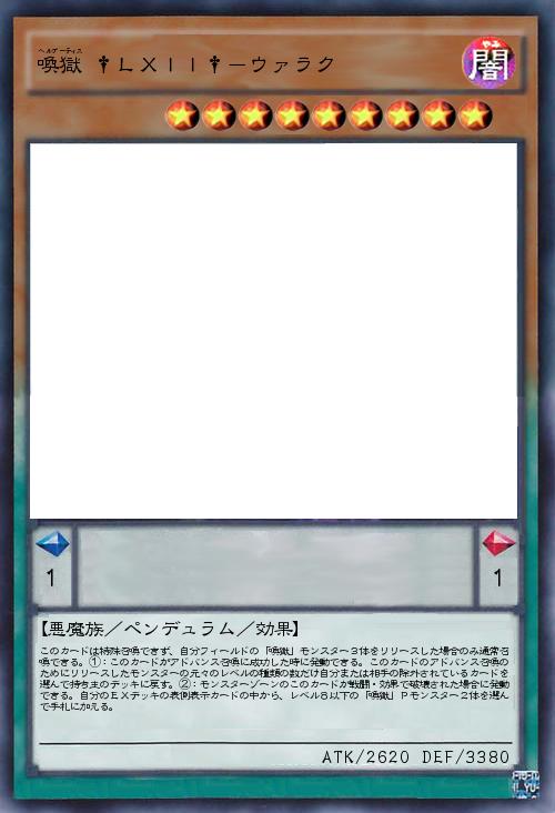 | このカードは特殊召喚できず、自分フィールドの「喚獄」モンスター3体をリリースした場合のみ通常召喚できる。①:このカードがアドバンス召喚に成功した時に発動できる。このカードのアドバンス召喚のためにリリースしたモンスターの元々のレベルの種類の数だけ自分または相手の除外されているカードを選んで持ち主のデッキに戻す。②:モンスターゾーンのこのカードが戦闘・効果で破壊された場合に発動できる。自分のEXデッキの表側表示カードの中から、レベル8以下の「喚獄」Pモンスター2体を選んで手札に加える。 | |||