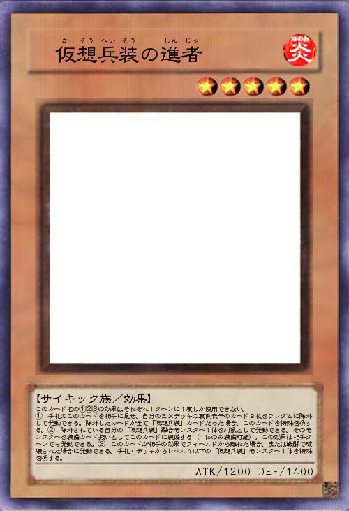 | このカード名の①②③の効果はそれぞれ1ターンに1度しか使用できない。 ①:手札のこのカードを相手に見せ、自分のEXデッキの裏側表示のカード3枚をランダムに除外して発動できる。除外したカードが全て「仮想兵装」カードだった場合、このカードを特殊召喚する。②:除外されている自分の「仮想兵装」融合モンスター1体を対象として発動できる。そのモンスターを装備カード扱いとしてこのカードに装備する(1体のみ装備可能)。この効果は相手ターンでも発動できる。③:このカードが相手の効果でフィールドから離れた場合、または戦闘で破壊された場合に発動できる。手札・デッキからレベル4以下の「仮想兵装」モンスター1体を特殊召喚する。 | |||