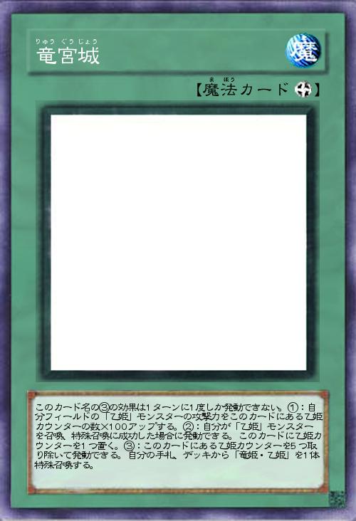 | このカード名の③の効果は1ターンに1度しか発動できない。①:自分フィールドの「乙姫」モンスターの攻撃力をこのカードにある乙姫カウンターの数×100アップする。②:自分が「乙姫」モンスターを召喚、特殊召喚に成功した場合に発動できる。このカードに乙姫カウンターを1つ置く。③:このカードにある乙姫カウンターを5つ取り除いて発動できる。自分の手札、デッキから「竜姫・乙姫」を1体特殊召喚する。 | |||