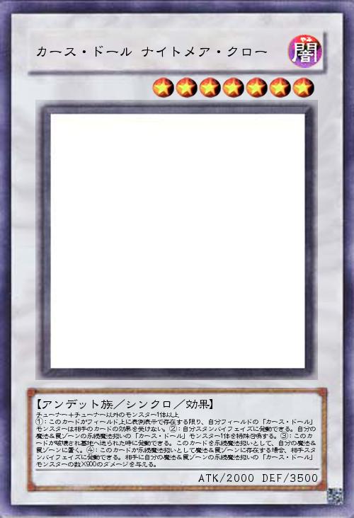 | チューナー+チューナー以外のモンスター1体以上 ①:このカードがフィールド上に表側表示で存在する限り、自分フィールドの「カース・ドール」モンスターは相手のカードの効果を受けない。②:自分スタンバイフェイズに発動できる。自分の魔法&罠ゾーンの永続魔法扱いの「カース・ドール」モンスター1体を特殊召喚する。③:このカードが破壊され墓地へ送られた時に発動できる。このカードを永続魔法扱いとして、自分の魔法&罠ゾーンに置く。④:このカードが永続魔法扱いとして魔法&罠ゾーンに存在する場合、相手スタンバイフェイズに発動できる。相手に自分の魔法&罠ゾーンの永続魔法扱いの「カース・ドール」モンスターの数×900のダメージを与える。 | |||