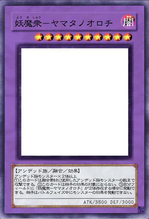 | アンデッド族モンスター×2体以上 ①このカードは融合素材に使用したアンデッド族モンスターの数まで攻撃できる。②このカードは相手の効果の対象にならない。③自分フィールドに「妖魔衆-ヤマタノオロチ」が2体存在する場合に発動できる。相手はバトルフェイズ中にモンスターの効果を発動できない。 | |||
