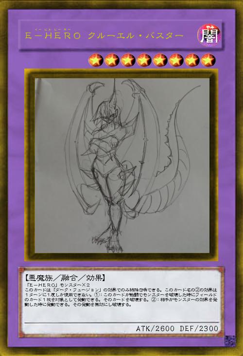 | 「E-HERO」モンスター×2 このカードは「ダーク・フュージョン」の効果でのみ特殊召喚できる。このカード名の②の効果は1ターンに1度しか使用できない。①:このカードが戦闘でモンスターを破壊した時にフィールドのカード1枚を対象として発動できる。そのカードを破壊する。②:相手がモンスターの効果を発動した時に発動できる。その発動を無効にし破壊する。 | |||