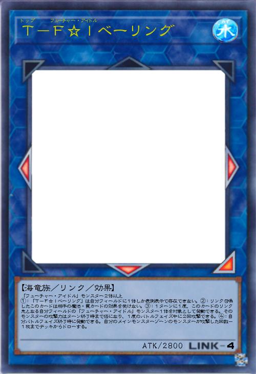 | 「フューチャー・アイドル」モンスター2体以上 ①:「T-F☆Iベーリング」は自分フィールドに1体しか表側表示で存在できない。②:リンク召喚したこのカードは相手の魔法・罠カードの効果を受けない。③:1ターンに1度、このカードのリンク先となる自分フィールドの「フューチャー・アイドル」モンスター1体を対象として発動できる。そのモンスターの攻撃力はターン終了時まで倍になり、1度のバトルフェイズ中に2回攻撃できる。④:自分バトルフェイズ終了時に発動できる。自分のメインモンスターゾーンのモンスターが攻撃した回数-1枚までデッキからドローする。 | |||