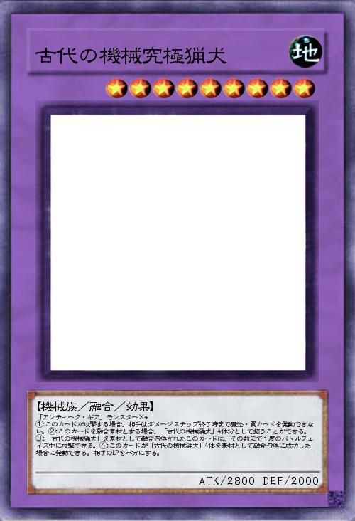 | 「アンティーク・ギア」モンスター×4 ①:このカードが攻撃する場合、相手はダメージステップ終了時まで魔法・罠カードを発動できない。②:このカードを融合素材とする場合、「古代の機械猟犬」4体分として扱うことができる。③:「古代の機械猟犬」を素材として融合召喚されたこのカードは、その数まで1度のバトルフェイズ中に攻撃できる。④:このカードが「古代の機械猟犬」4体を素材として融合召喚に成功した場合に発動できる。相手のLPを半分にする。 | |||