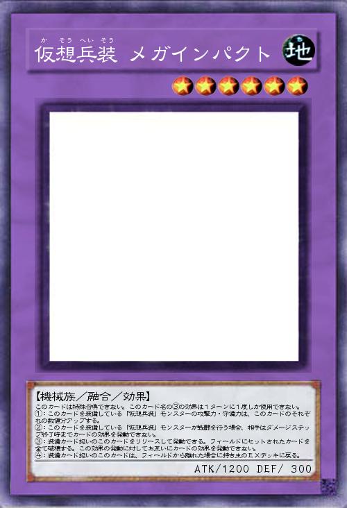 | このカードは特殊召喚できない。このカード名の③の効果は1ターンに1度しか使用できない。 ①:このカードを装備している「仮想兵装」モンスターの攻撃力・守備力は、このカードのそれぞれの数値分アップする。 ②:このカードを装備している「仮想兵装」モンスターが戦闘を行う場合、相手はダメージステップ終了時までカードの効果を発動できない。 ③:装備カード扱いのこのカードをリリースして発動できる。フィールドにセットされたカードを全て破壊する。この効果の発動に対してお互いにカードの効果を発動できない。 ④:装備カード扱いのこのカードは、フィールドから離れた場合に持ち主のEXデッキに戻る。 | |||