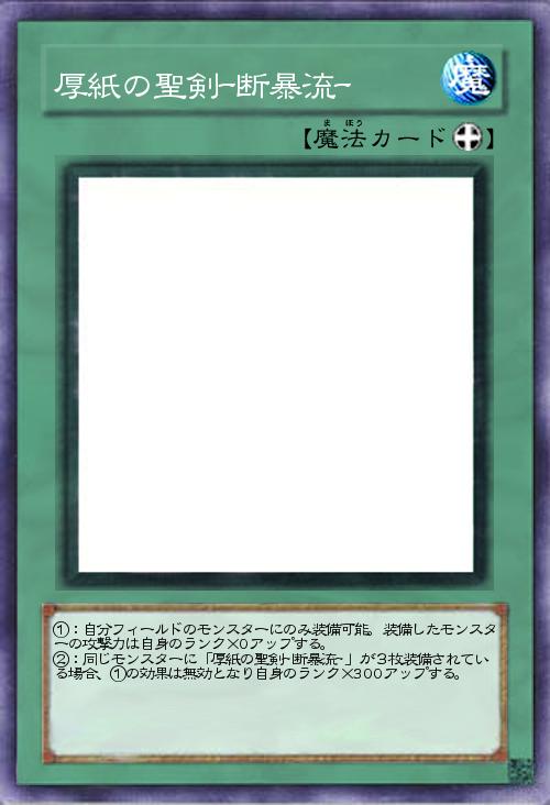 | ①:自分フィールドのモンスターにのみ装備可能。装備したモンスターの攻撃力は自身のランク×0アップする。 ②:同じモンスターに「厚紙の聖剣ー断暴流ー」が3枚装備されている場合、①の効果は無効となり自身のランク×300アップする。 | |||