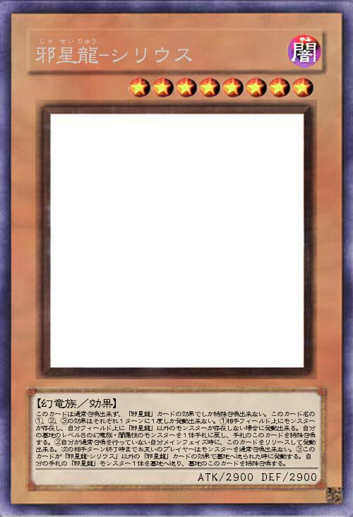 | このカードは通常召喚出来ず、「邪星龍」カードの効果でしか特殊召喚出来ない。このカード名の①、②、③の効果はそれぞれ1ターンに1度しか発動出来ない。①相手フィールド上にモンスターが存在し、自分フィールド上に「邪星龍」以外のモンスターが存在しない場合に発動出来る。自分の墓地のレベル8の幻竜族・闇属性のモンスターを1体手札に戻し、手札のこのカードを特殊召喚する。②自分が通常召喚を行っていない自分メインフェイズ時に、このカードをリリースして発動出来る。次の相手ターン終了時までお互いのプレイヤーはモンスターを通常召喚出来ない。③このカードが「邪星龍-シリウス」以外の「邪星龍」カードの効果で墓地へ送られた時に発動する。自分の手札の「邪星龍」モンスター1体を墓地へ送り、墓地のこのカードを特殊召喚する。 | |||