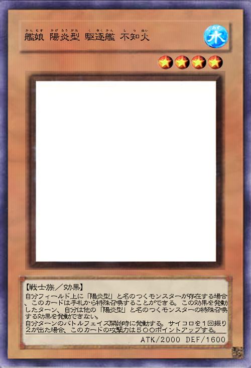 | 自分フィールド上に「陽炎型」と名のつくモンスターが存在する場合、このカードは手札から特殊召喚することができる。この効果を発動したターン、自分は他の「陽炎型」と名のつくモンスターの特殊召喚する効果を発動できない。 自分ターンのバトルフェイズ開始時に発動する。サイコロを1回振り2が出た場合、このカードの攻撃力は500ポイントアップする。 | |||