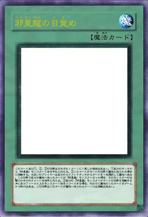 | このカード名の①、②、③の効果はそれぞれ1ターンに1度しか使用出来ない。①自分のデッキから「邪星龍」モンスター1体を手札に加える。②このカードがカードの効果で墓地に送られた場合に発動する。お互いのプレイヤーは自分のエクストラデッキからカードを1枚選択して墓地へ送る。この効果で自分が墓地へ送ったカードが「邪星龍」モンスターだった場合、そのモンスターの攻撃力の半分のダメージを相手に与える。③自分の「邪星龍」モンスターがカードの効果を発動する為に自分フィールド上のモンスター1体をリリースする場合、代わりに墓地のこのカードをゲームから除外出来る。この効果はこのカードが墓地へ送られたターンには発動出来ない。 | |||