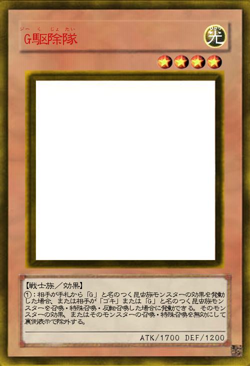 | ①:相手が手札から「G」と名のつく昆虫族モンスターの効果を発動した場合、または相手が「ゴキ」または「G」と名のつく昆虫族モンスターを召喚・特殊召喚・反転召喚した場合に発動できる。そのモンスターの効果、またはそのモンスターの召喚・特殊召喚を無効にして裏側表示で除外する。 | |||