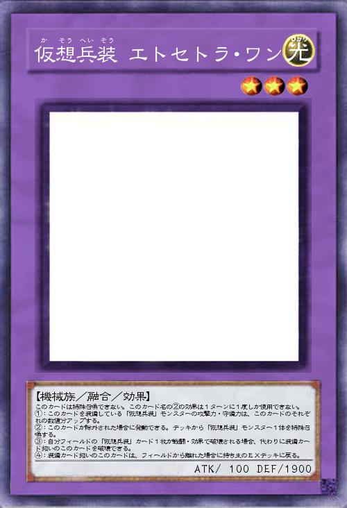 | このカードは特殊召喚できない。このカード名の②の効果は1ターンに1度しか使用できない。 ①:このカードを装備している「仮想兵装」モンスターの攻撃力・守備力は、このカードのそれぞれの数値分アップする。 ②:このカードが除外された場合に発動できる。デッキから「仮想兵装」モンスター1体を特殊召喚する。 ③:自分フィールドの「仮想兵装」カード1枚が戦闘・効果で破壊される場合、代わりに装備カード扱いのこのカードを破壊できる。 ④:装備カード扱いのこのカードは、フィールドから離れた場合に持ち主のEXデッキに戻る。 | |||