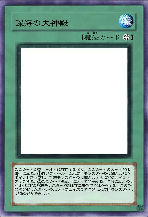| このカードがフィールドに存在する限り、このカードのカード名は「海」になる。①自分フィールドの水属性モンスターの攻撃力は200ポイントアップし、魚族モンスターの攻撃力はさらに200ポイントアップする。②このカードを墓地に送って発動する。自分の墓地のレベル4以下の魚族モンスターを2体守備表示で特殊召喚する。この効果を発動したターンのエンドフェイズまで自分は水属性モンスターしか特殊召喚できない。 | |||