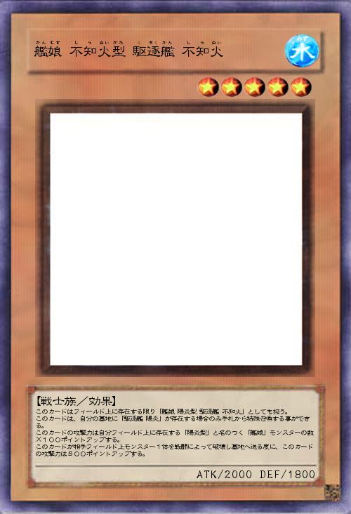 | このカードはフィールド上に存在する限り「艦娘 陽炎型 駆逐艦 不知火」としても扱う。 このカードは、自分の墓地に「駆逐艦 陽炎」が存在する場合のみ手札から特殊召喚する事ができる。 このカードの攻撃力は自分フィールド上に存在する「陽炎型」と名のつく「艦娘」モンスターの数×100ポイントアップする。 このカードが相手フィールド上モンスター1体を戦闘によって破壊し墓地へ送る度に、このカードの攻撃力は500ポイントアップする。 | |||