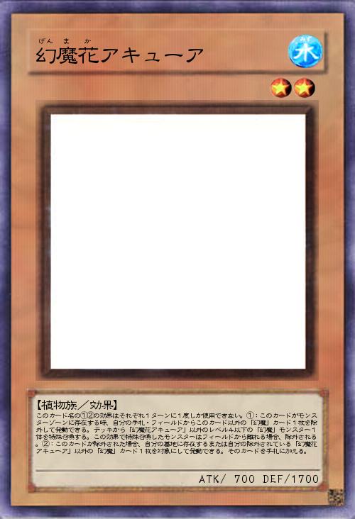 | このカード名の①②の効果はそれぞれ1ターンに1度しか使用できない。①:このカードがモンスターゾーンに存在する時、自分の手札・フィールドからこのカード以外の「幻魔」カード1枚を除外して発動できる。デッキから「幻魔花アキューア」以外のレベル4以下の「幻魔」モンスター1体を特殊召喚する。この効果で特殊召喚したモンスターはフィールドから離れる場合、除外される。②:このカードが除外された場合、自分の墓地に存在するまたは自分の除外されている「幻魔花アキューア」以外の「幻魔」カード1枚を対象にして発動できる。そのカードを手札に加える。 | |||
