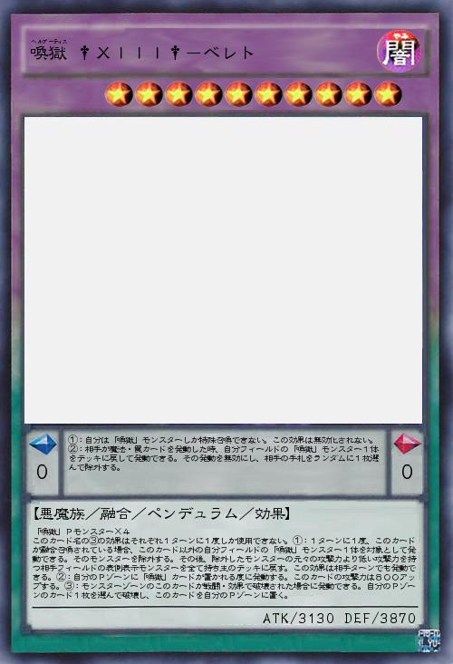 | 「喚獄」Pモンスター×4 このカード名の③の効果はそれぞれ1ターンに1度しか使用できない。①:1ターンに1度、このカードが融合召喚されている場合、このカード以外の自分フィールドの「喚獄」モンスター1体を対象として発動できる。そのモンスターを除外する。その後、除外したモンスターの元々の攻撃力より低い攻撃力を持つ相手フィールドの表側表示モンスターを全て持ち主のデッキに戻す。この効果は相手ターンでも発動できる。②:自分のPゾーンに「喚獄」カードが置かれる度に発動する。このカードの攻撃力は800アップする。③:モンスターゾーンのこのカードが戦闘・効果で破壊された場合に発動できる。自分のPゾーンのカード1枚を選んで破壊し、このカードを自分のPゾーンに置く。 | |||