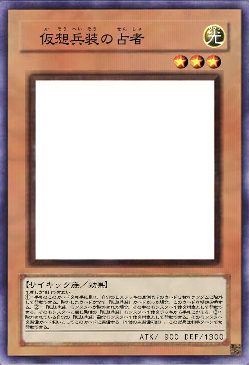 | 1度しか使用できない。 ①:手札のこのカードを相手に見せ、自分のEXデッキの裏側表示のカード2枚をランダムに除外して発動できる。除外したカードが全て「仮想兵装」カードだった場合、このカードを特殊召喚する。②:「仮想兵装」モンスターが除外された場合、その中のモンスター1体を対象として発動できる。そのモンスターと同じ属性の「仮想兵装」モンスター1体をデッキから手札に加える。③:除外されている自分の「仮想兵装」融合モンスター1体を対象として発動できる。そのモンスターを装備カード扱いとしてこのカードに装備する(1体のみ装備可能)。この効果は相手ターンでも発動できる。 | |||