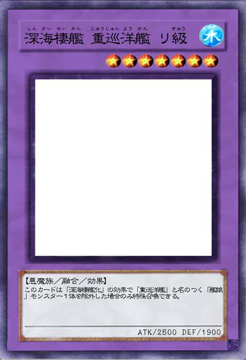 | このカードは「深海棲艦化」の効果で「重巡洋艦」と名のつく「艦娘」モンスター1体を除外した場合のみ特殊召喚できる。 | |||