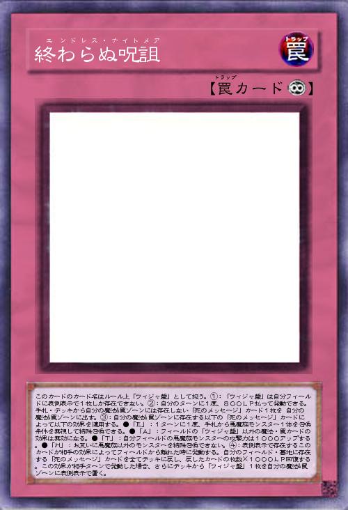 | このカードのカード名はルール上「ウィジャ盤」として扱う。①:「ウィジャ盤」は自分フィールドに表側表示で1枚しか存在できない。②:自分のターンに1度、800LP払って発動できる。手札・デッキから自分の魔法&罠ゾーンには存在しない「死のメッセージ」カード1枚を 自分の魔法&罠ゾーンに出す。③:自分の魔法&罠ゾーンに存在する以下の「死のメッセージ」カードによって以下の効果を適用する。●「E」:1ターンに1度、手札から悪魔族モンスター1体を召喚条件を無視して特殊召喚できる。●「A」:フィールドの「ウィジャ盤」以外の魔法・罠カードの効果は無効になる。●「T」:自分フィールドの悪魔族モンスターの攻撃力は1000アップする。●「H」:お互いに悪魔族以外のモンスターを特殊召喚できない。④:表側表示で存在するこのカードが相手の効果によってフィールドから離れた時に発動する。自分のフィールド・墓地に存在する「死 | |||
