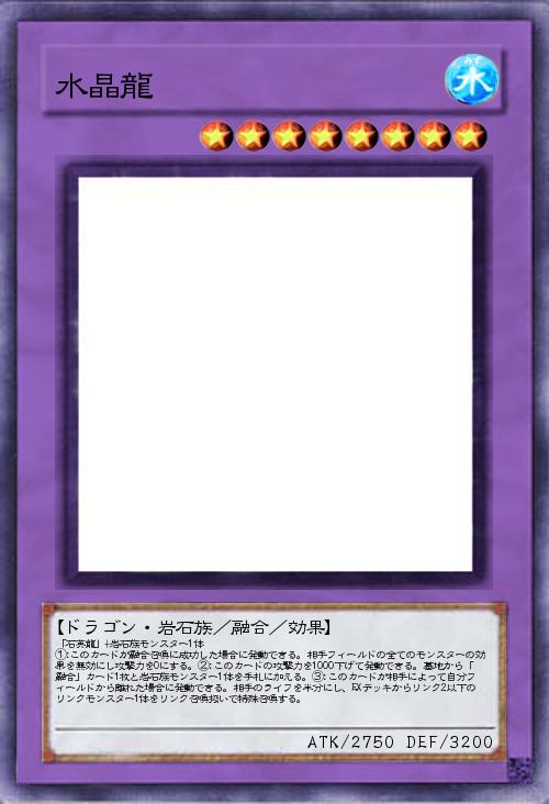 | 「石英龍」+岩石族モンスター1体 ①:このカードが融合召喚に成功した場合に発動できる。相手フィールドの全てのモンスターの効果を無効にし攻撃力を0にする。②:このカードの攻撃力を1000下げて発動できる。墓地から「融合」カード1枚と岩石族モンスター1体を手札に加える。③:このカードが相手によって自分フィールドから離れた場合に発動できる。相手のライフを半分にし、EXデッキからリンク2以下のリンクモンスター1体をリンク召喚扱いで特殊召喚する。 | |||