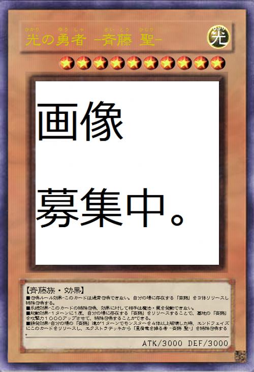 ■召喚ルール効果-このカードは通常召喚できない。自分の場に存在する「斉藤」を3体リリースし特殊召喚する。 ■永続効果-このカードの特殊召喚、効果に対して相手は魔法・罠を発動できない。 ■起動効果-1ターンに1度、自分の場に存在する「斉藤」をリリースすることで、墓地の「斉藤」を攻撃力1000アップさせて、特殊召喚することができる。 ■誘発効果-自分の場の「斉藤」達が1ターンでモンスターを4体以上破壊した時、エンドフェイズにこのカードをリリースし、エクストラデッキから「星屑竜を操る者 -斉藤 聖-」を特殊召喚する。 |