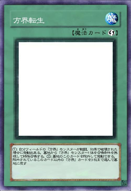 | ①:自分フィールドの「方界」モンスターが戦闘、効果で破壊された場合に発動出来る。墓地から「方界」モンスター1体を召喚条件を無視して特殊召喚する。②:墓地のこのカードを除外して発動できる。除外されているこのカード以外の「方界」カードを3枚まで選んで墓地に戻す | |||