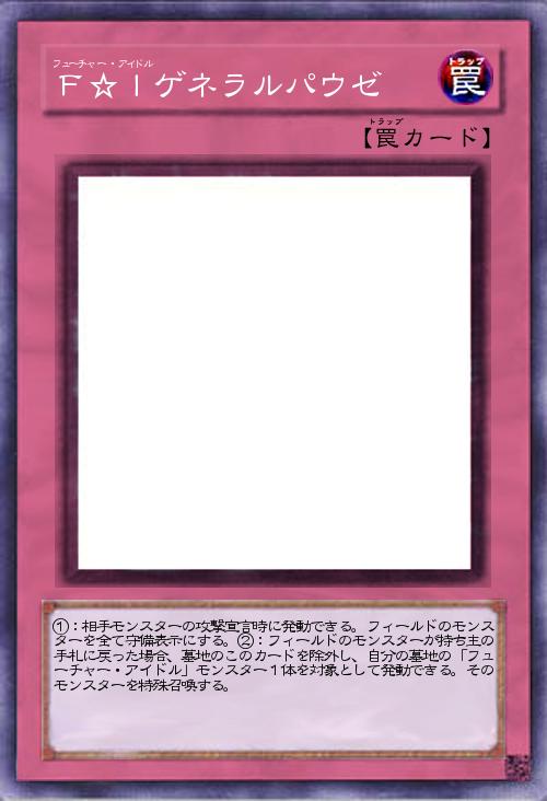 | ①:相手モンスターの攻撃宣言時に発動できる。フィールドのモンスターを全て守備表示にする。②:フィールドのモンスターが持ち主の手札に戻った場合、墓地のこのカードを除外し、自分の墓地の「フューチャー・アイドル」モンスター1体を対象として発動できる。そのモンスターを特殊召喚する。 | |||
