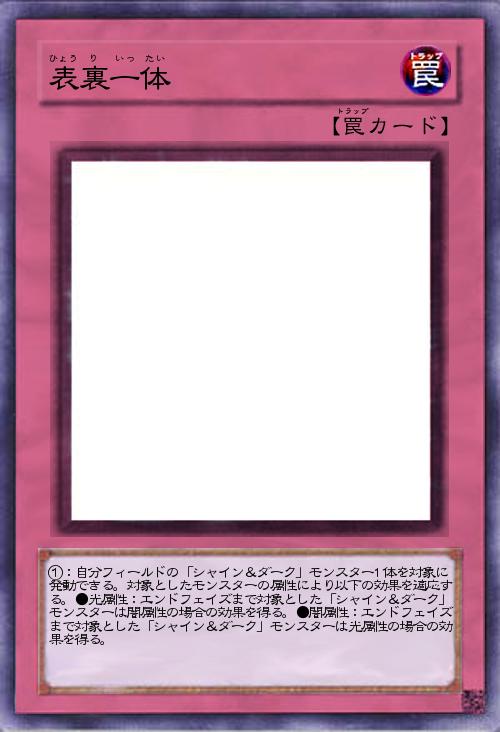 | ①:自分フィールドの「シャイン&ダーク」モンスター1体を対象に発動できる。対象としたモンスターの属性により以下の効果を適応する。●光属性:エンドフェイズまで対象とした「シャイン&ダーク」モンスターは闇属性の場合の効果を得る。●闇属性:エンドフェイズまで対象とした「シャイン&ダーク」モンスターは光属性の場合の効果を得る。 | |||