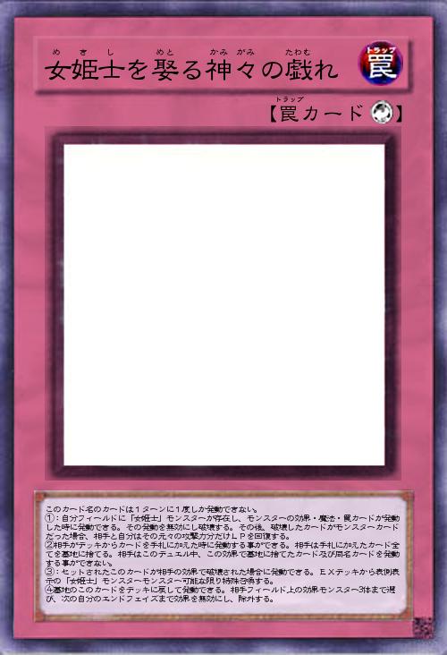 | このカード名のカードは1ターンに1度しか発動できない。 ①:自分フィールドに「女姫士」モンスターが存在し、モンスターの効果・魔法・罠カードが発動した時に発動できる。その発動を無効にし破壊する。その後、破壊したカードがモンスターカードだった場合、相手と自分はその元々の攻撃力分だけLPを回復する。 ②相手がデッキからカードを手札に加えた時に発動する事ができる。相手は手札に加えたカード全てを墓地に捨てる。相手はこのデュエル中、この効果で墓地に捨てたカード及び同名カードを発動する事ができない。 ③:セットされたこのカードが相手の効果で破壊された場合に発動できる。EXデッキから表側表示の「女姫士」モンスターモンスター可能な限り特殊召喚する。 ④墓地のこのカードをデッキに戻して発動できる。相手フィールド上の効果モンスター3体まで選び、次の自分のエンドフェイズまで効果を無効にし、除外する。 | |||