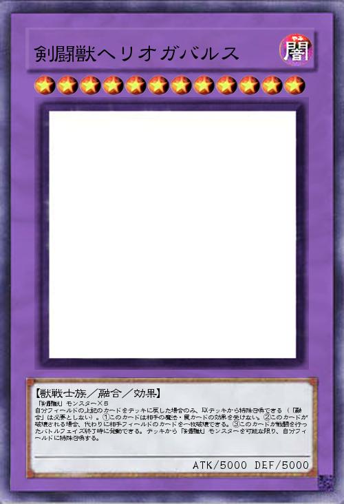 | 「剣闘獣」モンスター×5 自分フィールドの上記のカードをデッキに戻した場合のみ、EXデッキから特殊召喚できる(「融合」は必要としない)。①このカードは相手の魔法・罠カードの効果を受けない。②このカードが破壊される場合、代わりに相手フィールドのカードを一枚破壊できる。③このカードが戦闘を行ったバトルフェイズ終了時に発動できる。デッキから「剣闘獣」モンスターを可能な限り、自分フィールドに特殊召喚する。 | |||