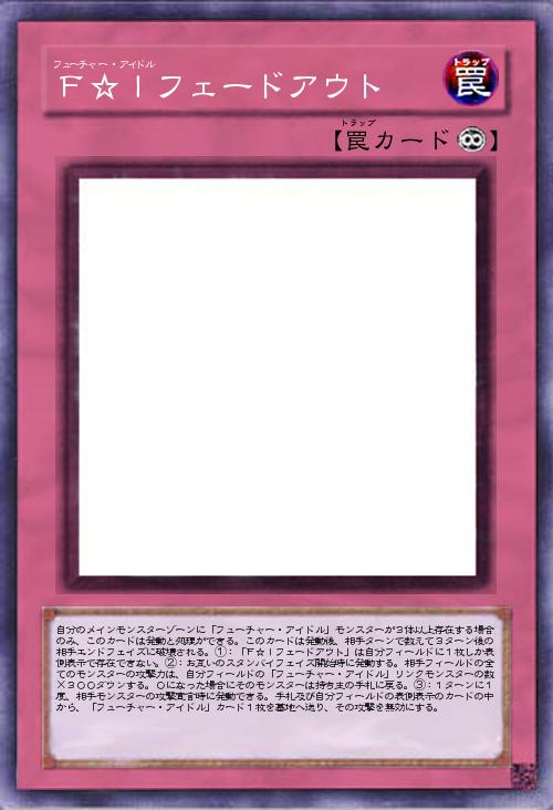 | 自分のメインモンスターゾーンに「フューチャー・アイドル」モンスターが3体以上存在する場合のみ、このカードは発動と処理ができる。このカードは発動後、相手ターンで数えて3ターン後の相手エンドフェイズに破壊される。①:「F☆Iフェードアウト」は自分フィールドに1枚しか表側表示で存在できない。②:お互いのスタンバイフェイズ開始時に発動する。相手フィールドの全てのモンスターの攻撃力は、自分フィールドの「フューチャー・アイドル」リンクモンスターの数×300ダウンする。0になった場合にそのモンスターは持ち主の手札に戻る。③:1ターンに1度、相手モンスターの攻撃宣言時に発動できる。手札及び自分フィールドの表側表示のカードの中から、「フューチャー・アイドル」カード1枚を墓地へ送り、その攻撃を無効にする。 | |||