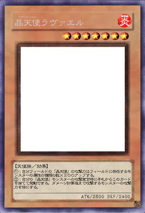 | ①:自分フィールドの「晶天使」の攻撃力はフィールドに存在するモンスターの属性の種類の数×200アップする。 ②:自分の「晶天使」モンスターの攻撃宣言時に手札からこのカードを捨てて発動できる。ダメージ計算後まで攻撃するモンスターの攻撃力を倍にする。 | |||