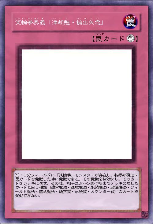 | ①:自分フィールドに「笑輪拳」モンスターが存在し、相手が魔法・罠カードを発動した時に発動できる。その発動を無効にし、そのカードをデッキに戻す。その後、相手はターン終了時までデッキに戻したカードと同じ種類(通常魔法・速攻魔法・永続魔法・装備魔法・フィールド魔法・儀式魔法・通常罠・永続罠・カウンター罠)のカードを発動できない。 | |||